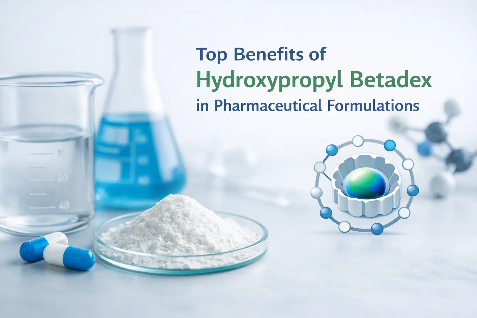 Upang matiyak na gumagana ang paggamit ng parmasyutiko, mahalagang maunawaan ang mahahalagang katangian ng hydroxypropyl beta-cyclodextrin. Ang molecular weight ay karaniwang nasa pagitan ng 1,400 at 1,800 Da, at ang solubility ay apektado ng antas ng pagbabago. Natutunaw ito sa higit sa 500 mg/mL ng tubig, na isang malaking pagpapabuti sa 18.5 mg/mL na solubility ng katutubong beta-cyclodextrin.