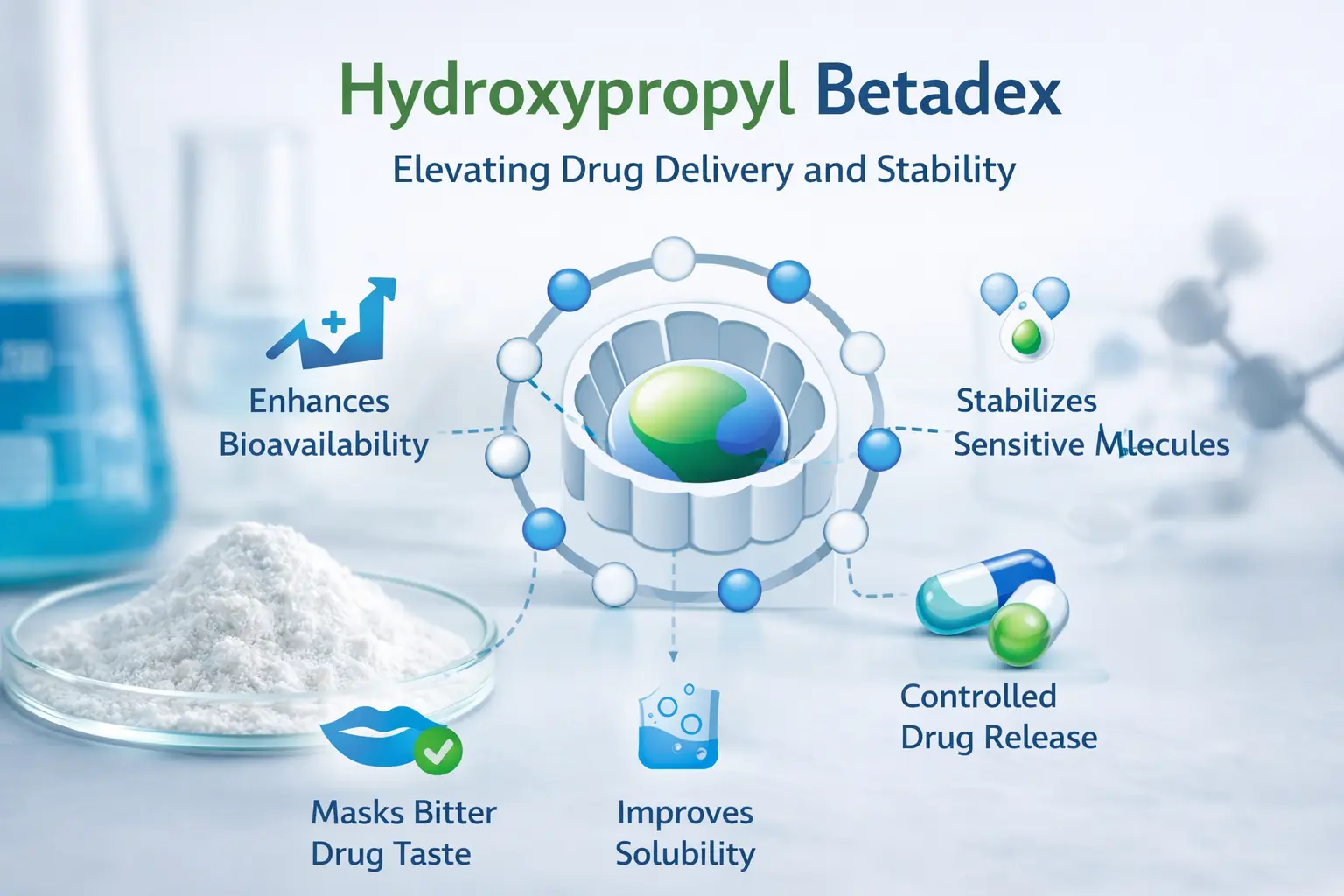 Sa kinokontrol na pagpapalabas, maaaring baguhin ng mga formulator kung paano inilalabas ang mga gamot nang hindi kinakailangang gumamit ng mga kumplikadong paraan ng paghahatid. Maaaring baguhin ng Hydroxypropyl Betadex kung paano nakikipag-ugnayan ang molekula ng bisita sa molekula ng host upang makamit ang mga instant, matagal, o naka-target na mga pattern ng paglabas. Ang kakayahang magamit na ito ay nagpapaikli sa oras na kinakailangan upang lumikha ng mga bagong gamot at ginagawang mas madali para sa mga pasyente na sundin ang kanilang mga plano sa pagdodos, na nagpapahusay sa pagsunod.